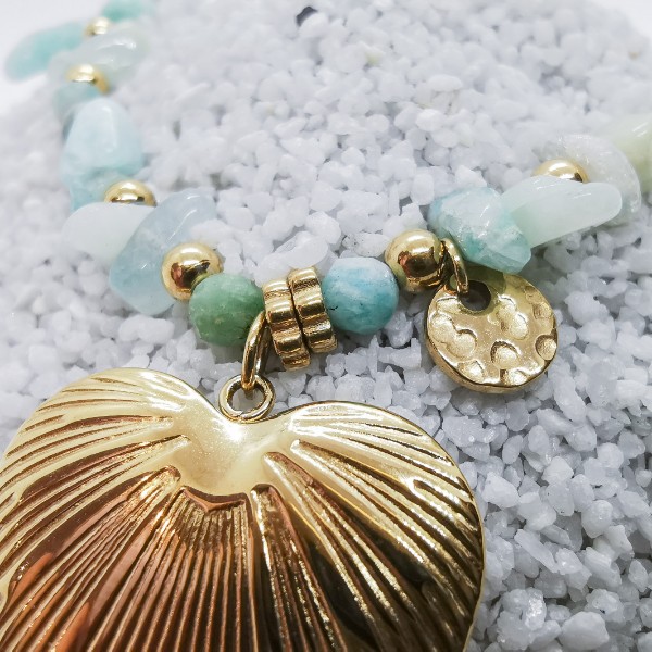 C'est un collier ras de cou fait de perles dorées en acier inoxydable, ainsi que des pierres en Amazonite véritables accompagné d'un coeur doré aux allures de coquillages.