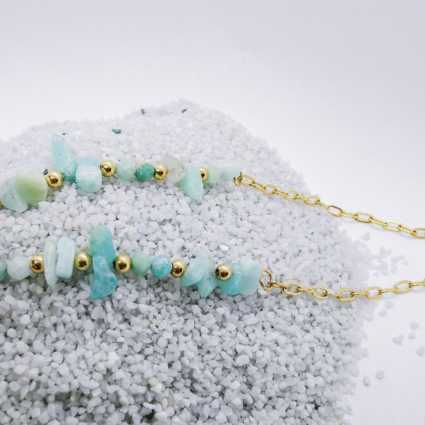 Le mix perles dorées et pierres. En lithothérapie l'amazonite est symbole de courage et de vérité.